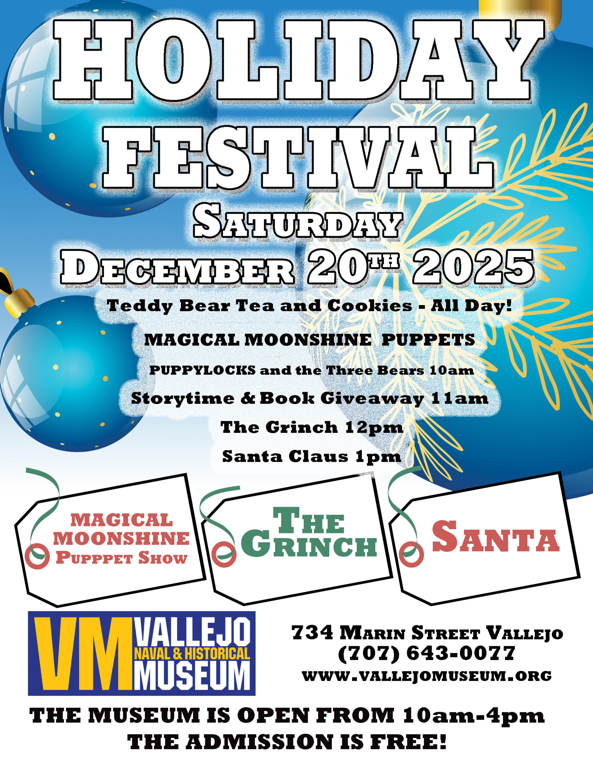 Vallejo Museum's Annual Holiday Festival! - Teddy Bear Tea and Cookies! ALL DAY! - Magical Moonshine Puppet Show! 10am - Storytime and Book Give Away! 11am - The Grinch! 12pm - A special visit with SANTA CLAUS! 1pm Family friendly holiday fun! Saturday December 20th 10am - 4pm