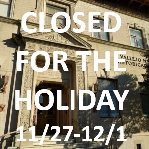 THE VALLEJO MUSEUM WILL BE CLOSED FOR THE THANKSGIVING HOLIDAY WEEKEND! NOV. 27 - DEC. 1. WE WILL REOPEN TO THE PUBLIC ON TUESDAY DEC. 2. THANK YOU!