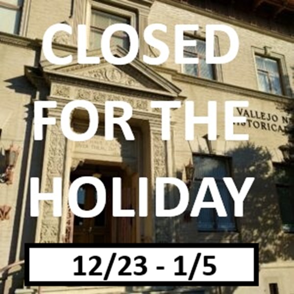 Vallejo Naval and Historical Museum 734 Marin Street, Vallejo, CA, United StatesTHE VALLEJO MUSEUM WILL BE CLOSED TO THE PUBLIC DURING THE HOLIDAYS! Dec. 23 - Jan. 5 WE WILL REOPEN TO THE PUBLIC ON TUESDAY January 6th. THANK YOU!